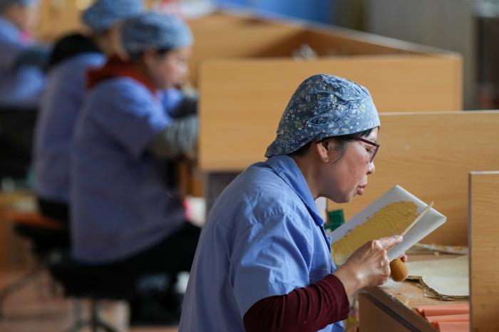 在南京金陵金箔集团股份有限公司,工人使用鹅毛将打制好的金箔从乌金纸中移到毛胎纸内(2月10日摄)。