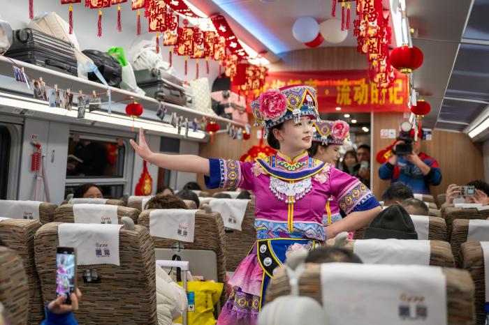 2月10日,在D38次列车上,乘务员表演民族舞蹈。