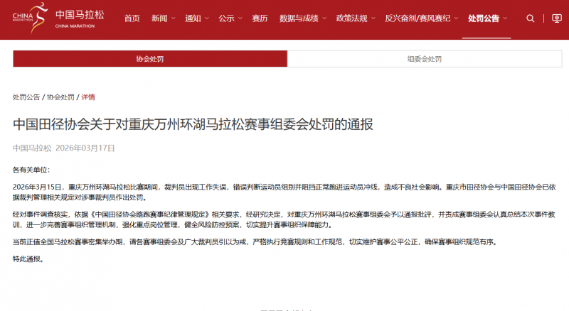 3月17日,中国田径协会官方账号,发布对重庆万州环湖马拉松赛涉事裁判,和赛事组委会处罚的通报。通报称,中国田径协会已依据裁判管理相关规定,对裁判员诸某给予停止参与中国境内路跑赛事裁判工作两年的追加处罚(2026年3月16日至2028年3月15日)。同时对赛事组委会予以通报批评。