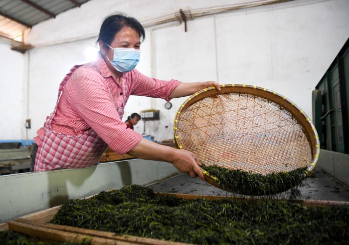 3月27日,在荣安三月茶叶专业合作社制茶作坊内,茶农在制茶。