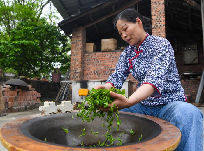 3月27日,在荣安三月茶叶专业合作社茶园内,茶农在手工制茶。