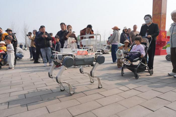 机器狗进行巡逻检查和定点值守。活动现场,各类机器人在公园场景进行应用和展示。