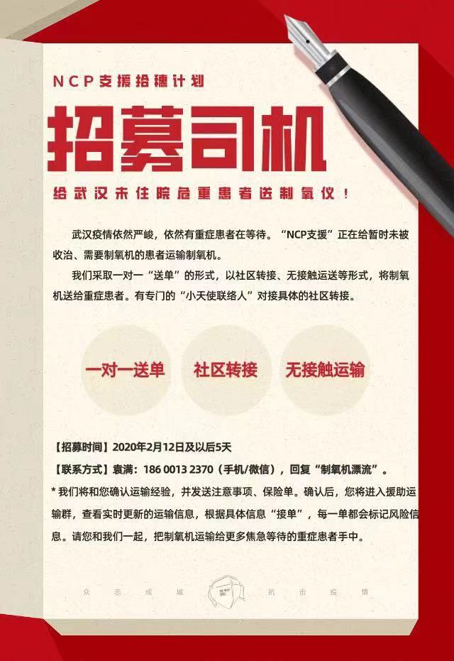 由于配送困难,仍有好几百台制氧机没能派出,NCP生命支援希望借助深一度平台招募一些湖北境内的司机,以下是联系方式。